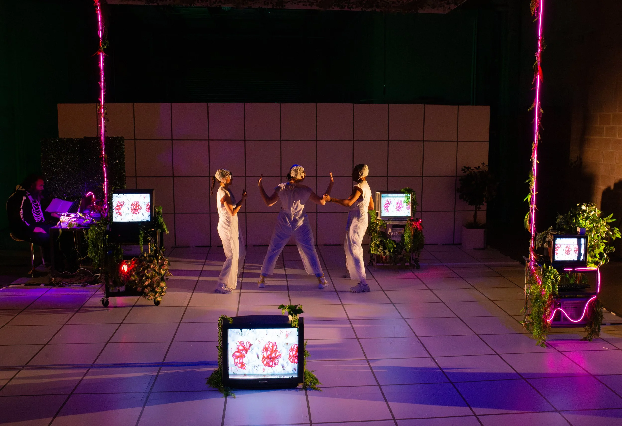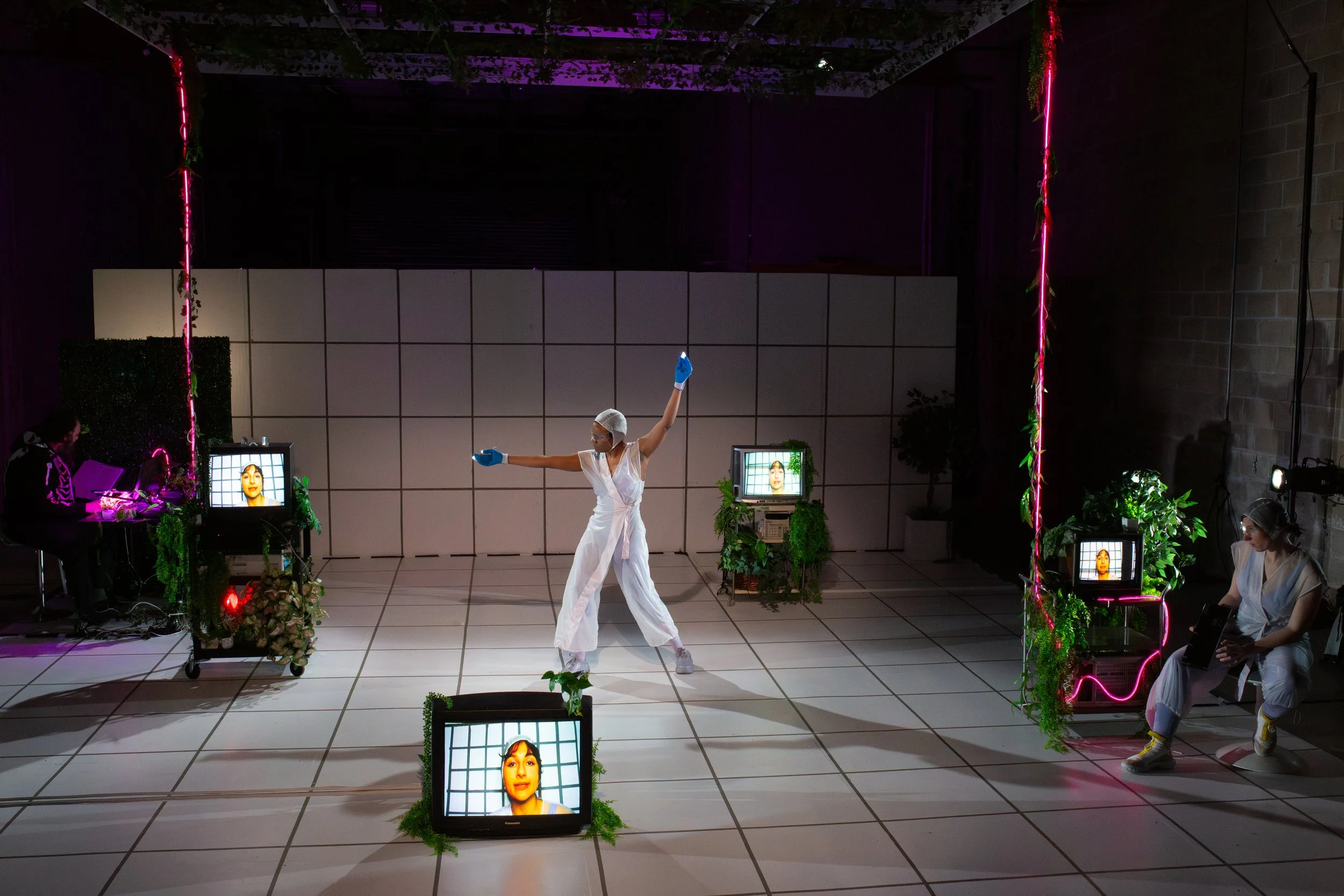Materials: cathode ray tubes, analog feedback loops, flowers, DVD menu animation, Windows 95 start-up samples, Isadora, live camera feed, signal bends